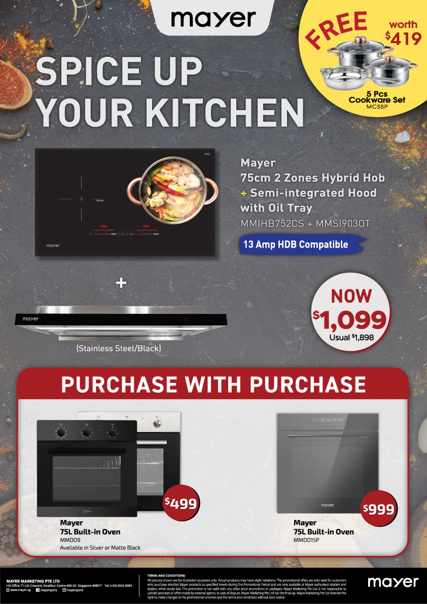 Spice Up Your Kitchen & Unlock Ultimate Flexibility Package not enough? No worries! Grab the 60cm 75L Built-in Oven (MMDO9) for just $499.00 (originally $999.00) or the 75L Built-In Oven (MMDO15P) for only $999.00 (originally $1,899.00) after buying either package through Mayer’s Purchase with Purchase (PWP) offer.