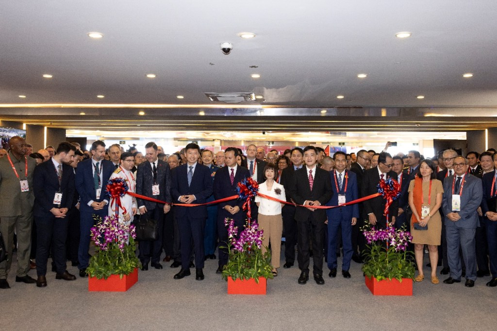 Guests-of Honour Minister for Transport and Second Minister for Finance, Mr Chee Hong Tat, and Senior Minister of State for Defence, Mr Heng Chee How, at the official ribbon cutting ceremony of Singapore Airshow 2024, held at the Changi Exhibition Centre.