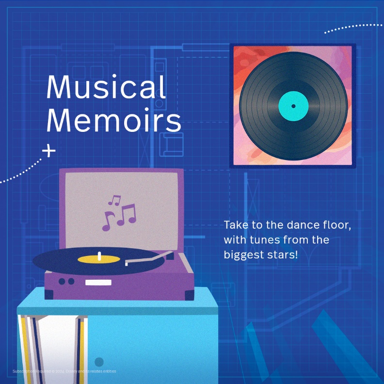 Step into the living room where adventure awaits. Dive into the epic worlds available on Disney+ in stunning 4K quality. Sit back, relax and admire the treasure trove of collectibles within the space as you watch a selection of trailers including Turning Red, Avatar: The Way of Water and Loki S2. - Musical Memoirs