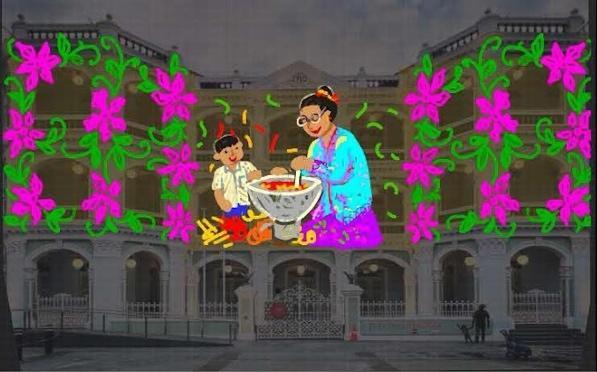 Peranakan Museum comes alive with Singaporean artist Yip Yew Chong’s first foray into digital animation and projection mapping, as he lights up the façade with Mari Kita Makan. As an extension of his captivating and nostalgic murals across Singapore, Mari Kita Makan is a visual storytelling of a Peranakan feast. Audiences will be enchanted by a Nyonya and her grandson bonding as they mix spices and herbs together, joyous scenes of a multicultural tok panjang (long table) family dinner, and the sharing of Peranakan kuehs (sweet and savoury snacks) to end the meal.