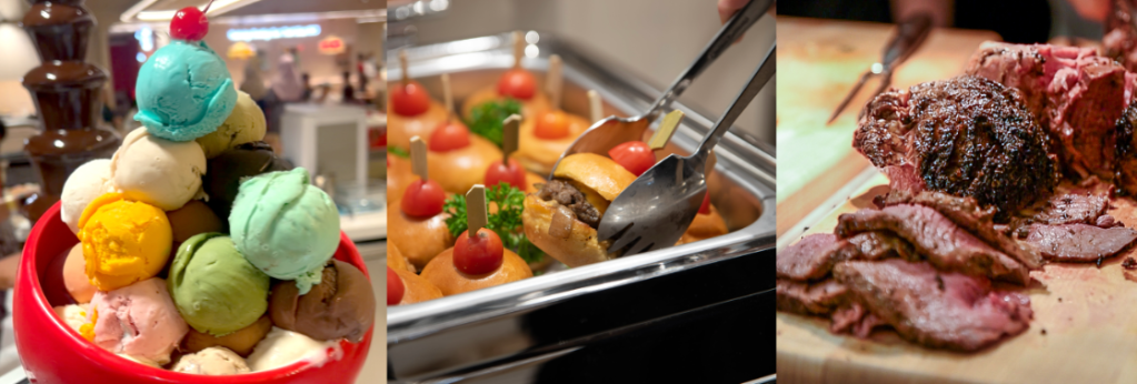 L-R: 48 ice cream & gelato flavours to discover, delightful hot mains, and juicy roast meats at the live carving station