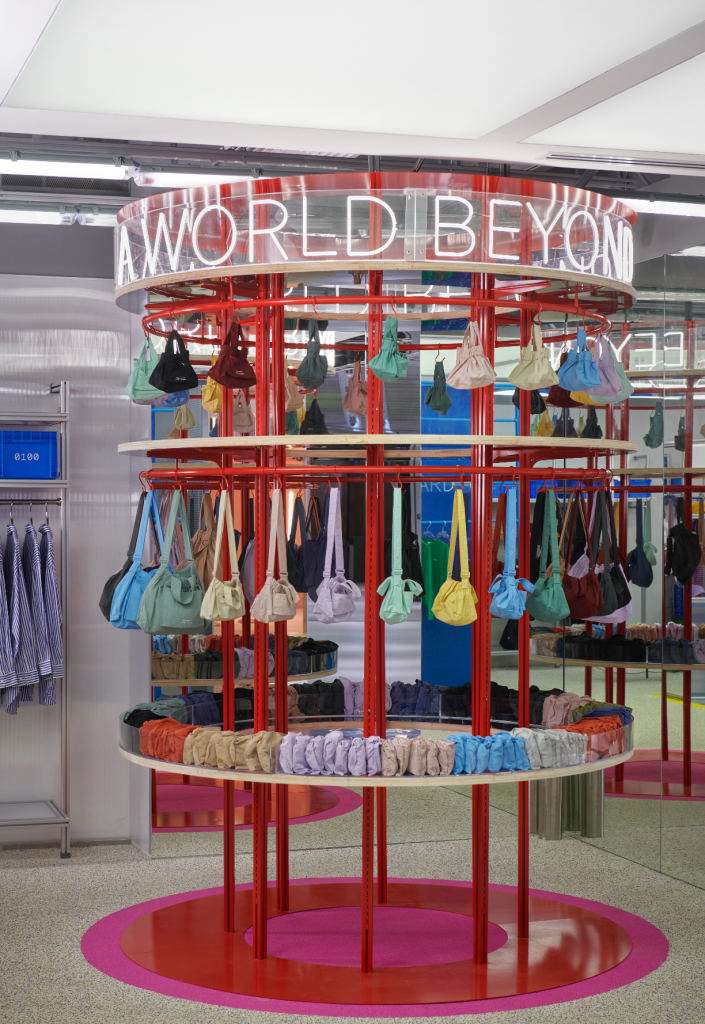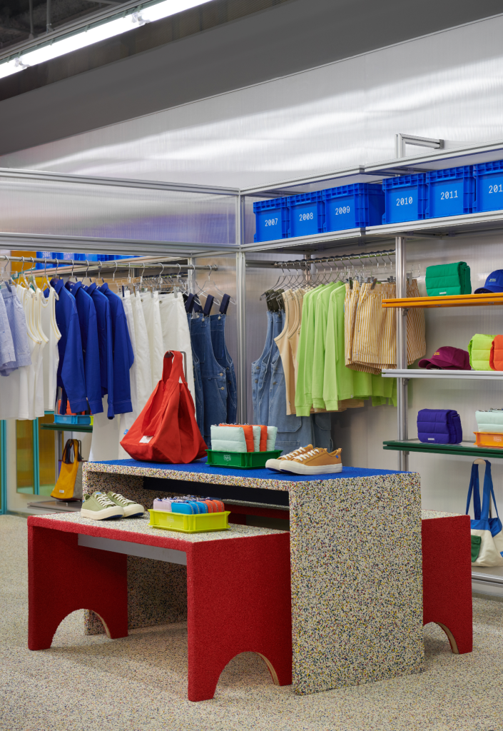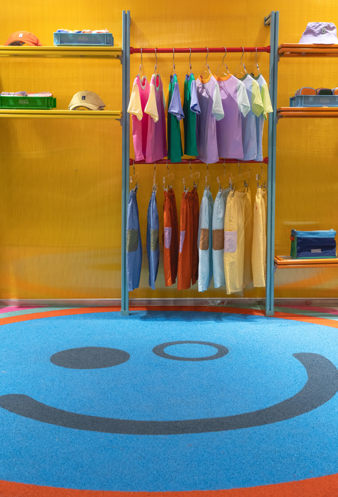 The floor, reminiscent of playful childhood playgrounds, is covered with colourful EPDM rubber, with transitions into stainless steel, terracotta tiles, and black chevron wood in selected areas, each material thoughtfully chosen for its respective section of the store.