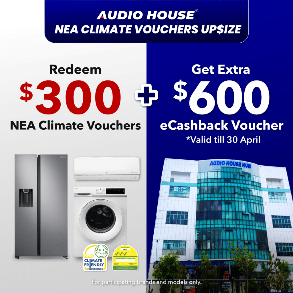 Audio House, known to be Singapore’s low price champion for over 30 years, is pleased to announce its support for the National Environment Agency’s (NEA) Climate Friendly Households Programme (CFHP) by accepting the $300 Climate Vouchers distributed to all HDB households for energy saving appliances from 15 April 2024.