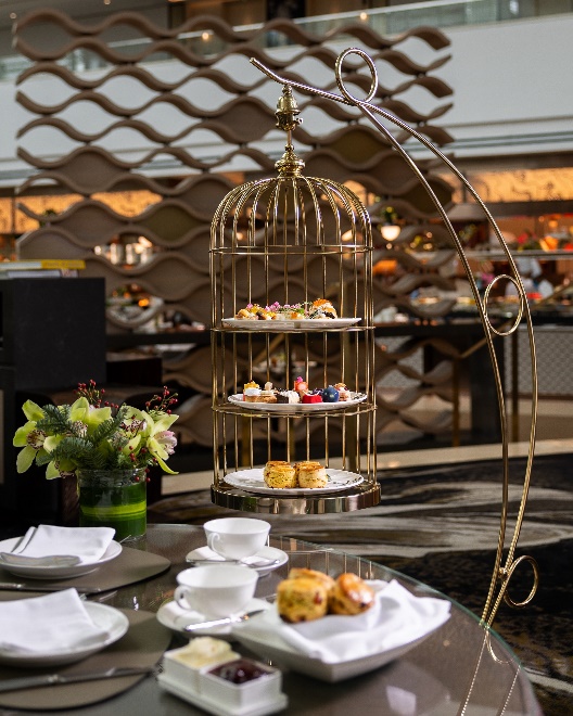 Presented in a golden bird cage tableside, Renku’s signature afternoon tea set charms with an exquisite array of freshly baked scones, savouries and dainty sweets