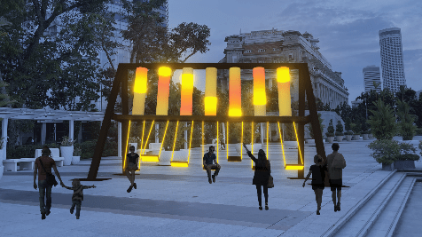 Over at Clifford Square, next to The Fullerton Bay Hotel Singapore, visitors will be captivated by the Fountain of Happiness by 27June Studio, presented by The Fullerton Heritage. This installation features seven sets of swings and light tubes resembling fountains. The movement of the swings generates energy that lights up the square with a brilliant display of colours as visitors take a seat, bringing joy to each interaction.
