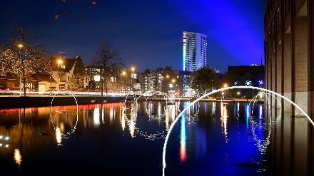 Arc ZERO: Nimbus by Studio James Tapscott encircles the floating pontoon near the Red Dot Design Museum. Visitors can take a walk along the pontoon and view the city skyline through a ring of mist, animated with the lifeblood of our existence – water, air and light.