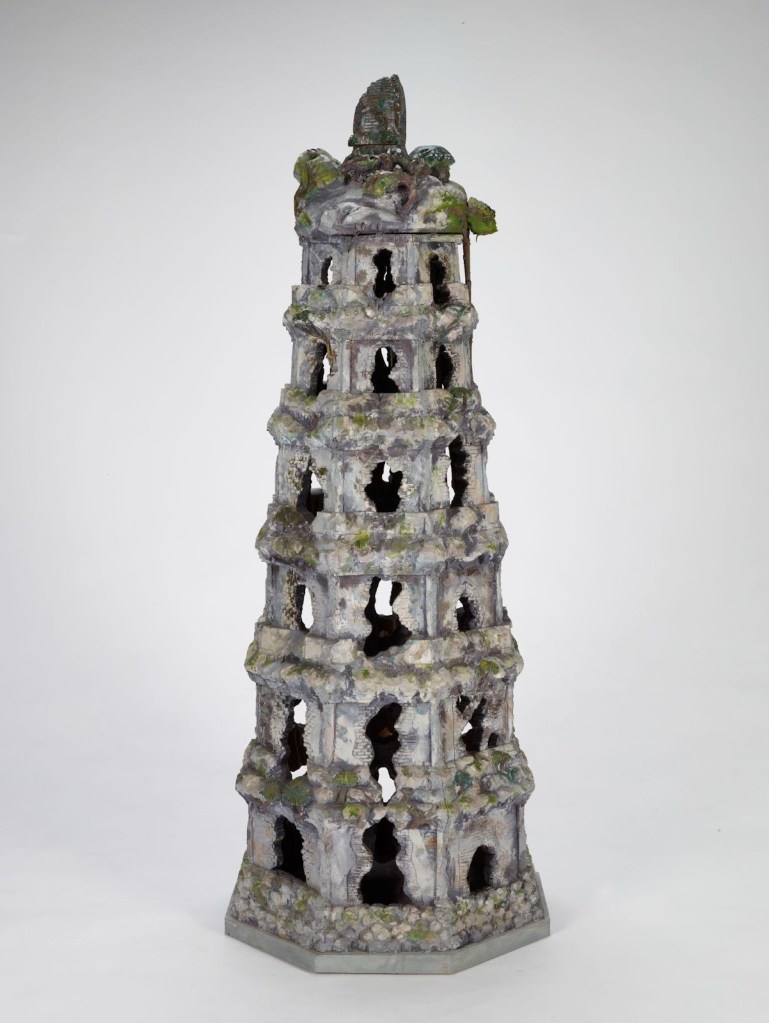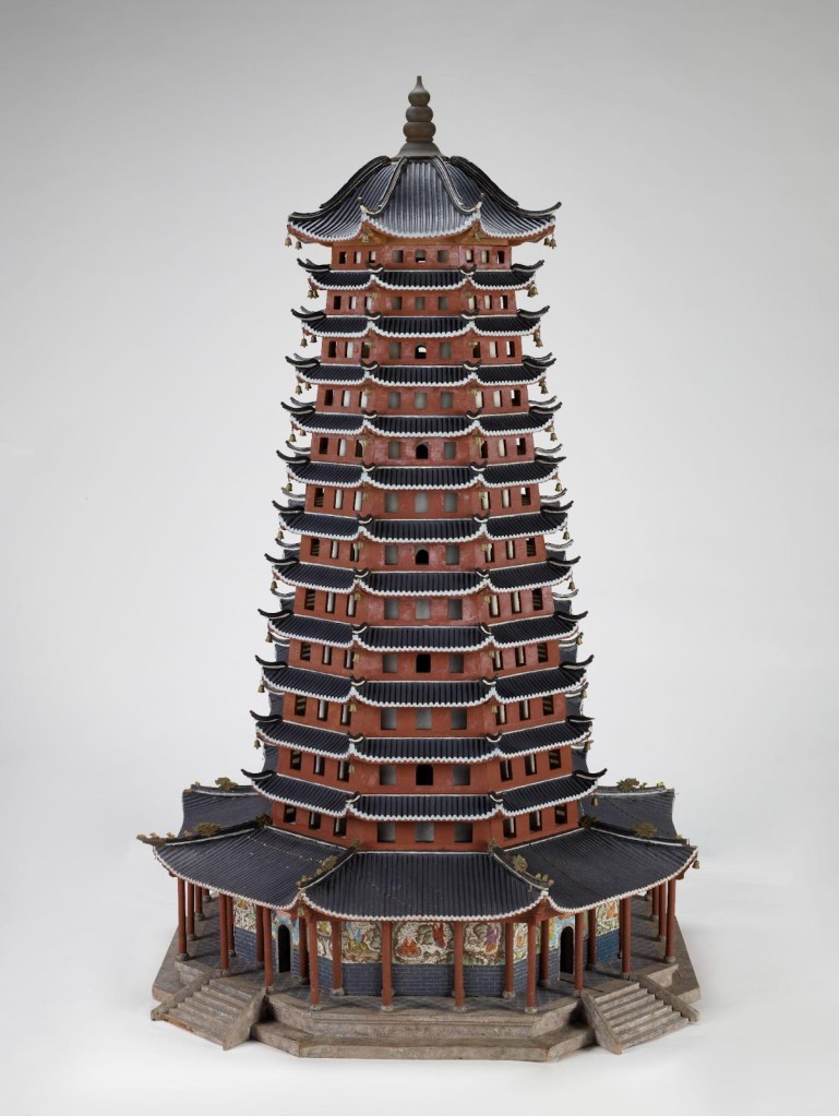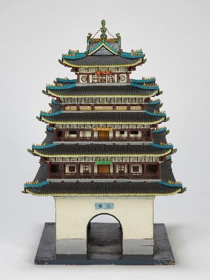 This minaret was added to Huaisheng Mosque – one of the oldest mosques in China – during renovations to the city in the 11th century. It had a dual purpose, calling Muslims to prayer and guiding ships to port. This model is the only example of an Islamic structure in the set that was sent to the exposition. It is an idealised version: bricks on the exterior are emphasised to suggest resilience, and it restores a calabash-shaped finial that had been destroyed by the early 18th century.