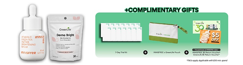 From July 4-18, consumers can purchase the limited-edition Brightening Power Duo set for only $68 (save up to 39%). The set includes INNISFREE Vitamin C Green Tea Brightening Serum 50ml and GreenLife Derma Bright 30 softgels—an exclusive pack size specially created for this collaboration. Additionally, each purchase comes with a limited-edition INNISFREE x GreenLife Pouch.