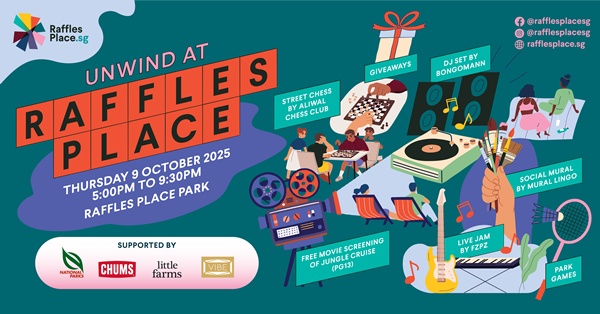 Join us from 5:00pm on Thursday, 9 October 2025 for UNWIND @ Raffles Place at Raffles Place Park, right above Raffles Place MRT station!